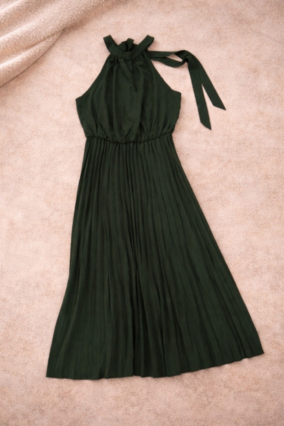 Plisowana sukienka w pięknym ciemnozielonym kolorze to idealna propozycja dla kobiet ceniących sobie elegancję oraz wygodę. Model ten charakteryzuje się delikatnymi plisami na dole, które dodają mu lekkości i sprawiają, że ładnie układa się podczas chodzenia. Dodatkowo sukienka posiada efektowne wiązanie przy szyi, nadając całości wyjątkowego uroku.